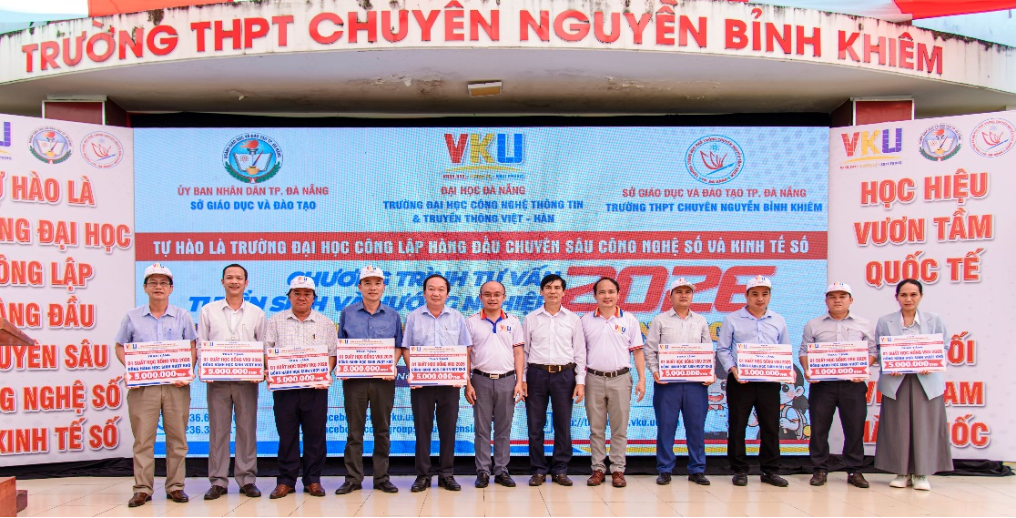 Dịp này, VKU công bố chương trình học bổng với tổng kinh phí 1 tỉ đồng dành cho học sinh khu vực miền Trung - Tây Nguyên dành cho các em có hoàn cảnh khó khăn, nhằm hỗ trợ và khuyến khích học tập.