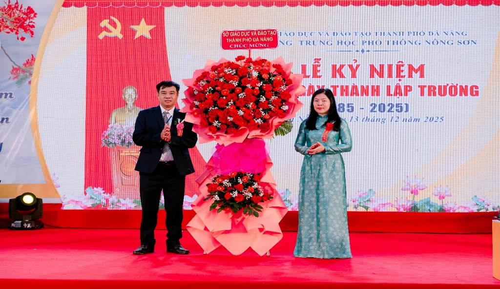 Phát biểu tại buổi lễ, nhà giáo Lê Thị Bích Thuận, Thành ủy viên, Giám đốc Sở Giáo dục và Đào tạo thành phố Đà Nẵng, thay mặt lãnh đạo ngành, đồng chí gửi lời chúc mừng nồng nhiệt, lời tri ân sâu sắc đến các thế hệ thầy cô giáo, cán bộ, nhân viên và học sinh Trường Trung học phổ thông Nông Sơn qua các thời kỳ.