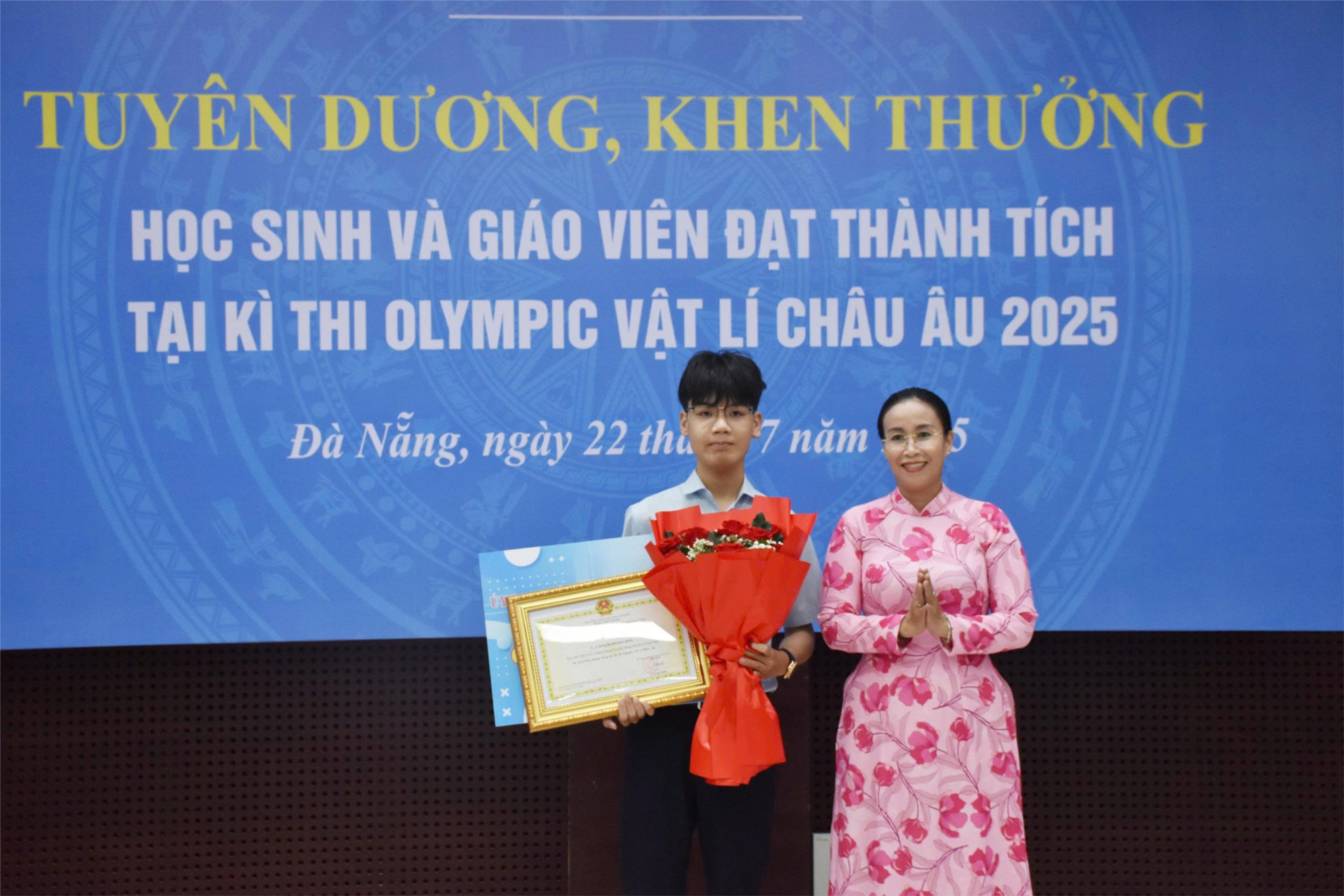 Tại buổi tuyên dương, UBND thành phố đã tặng Bằng khen kèm theo tiền thưởng 60.000.000 đồng cho em Cáp Kim Hoàng Bảo và 28.000.000 đồng cho tập thể thầy, cô giáo đã tham gia bồi dưỡng. Ngoài ra, Công ty Cổ phần Đầu tư khai thác Nhà ga Quốc tế Đà Nẵng cũng đã trao thưởng 25.000.000 đồng cho em Cáp Kim Hoàng Bảo.